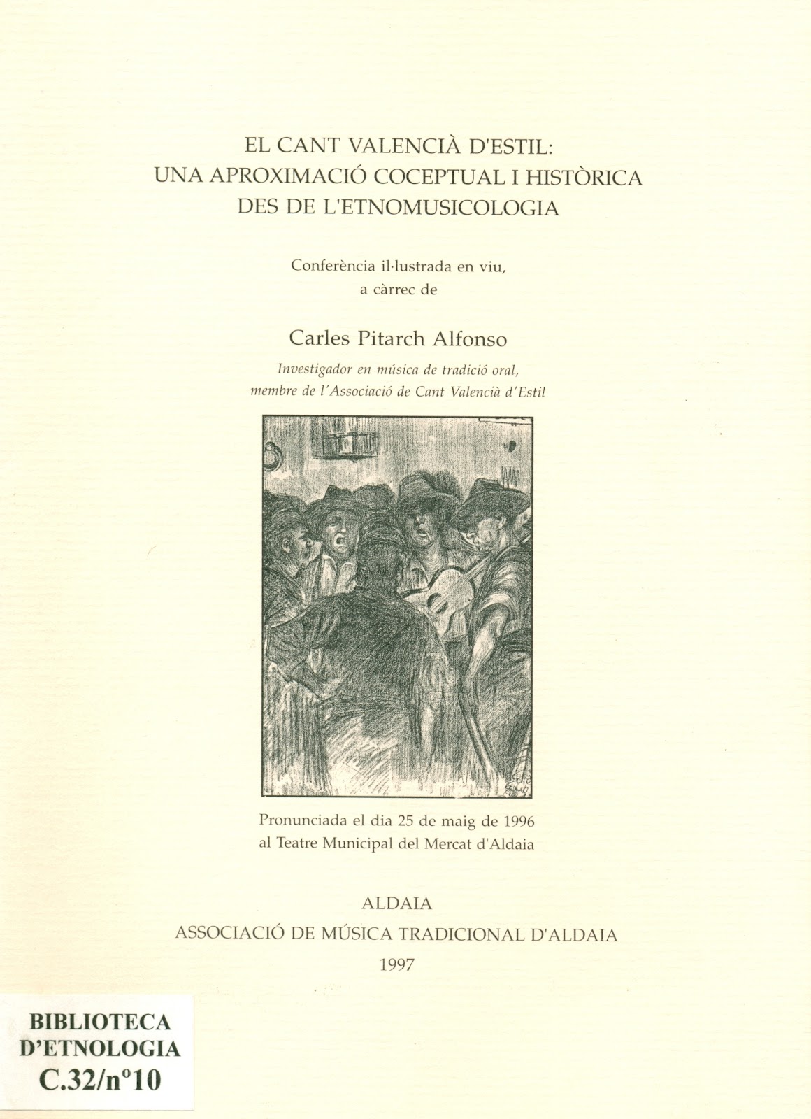 PITARCH ALFONSO, Carles. El cant valencià d’estil : una aproximació conceptual i històrica des de l’etnomusicologia. Aldaia : Associació de Música Tradicional d’Aldaia, 1997 – BETNO C.32 / nº10