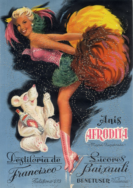 Este anunci d’Anis Afrodita el protagonitza una rata amb una botella d’anís que ofereix una copa a una xica patinadora a l’estil pin-up. Potser fins i tot que el dibuixant prenguera com a model a l’actriu Doris Day (mireu com se semblen), una icona dels anys 50.