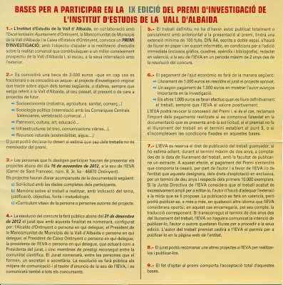 L’Institut d’Estudis de la Vall d’Albaida ha tret en col·laboració amb l’Ajuntament d’Ontinyent i la Caixa d’Estalvis d’Ontinyent la convocatòria a la nova edició de premis d’investigació de la Vall d’Albaida.