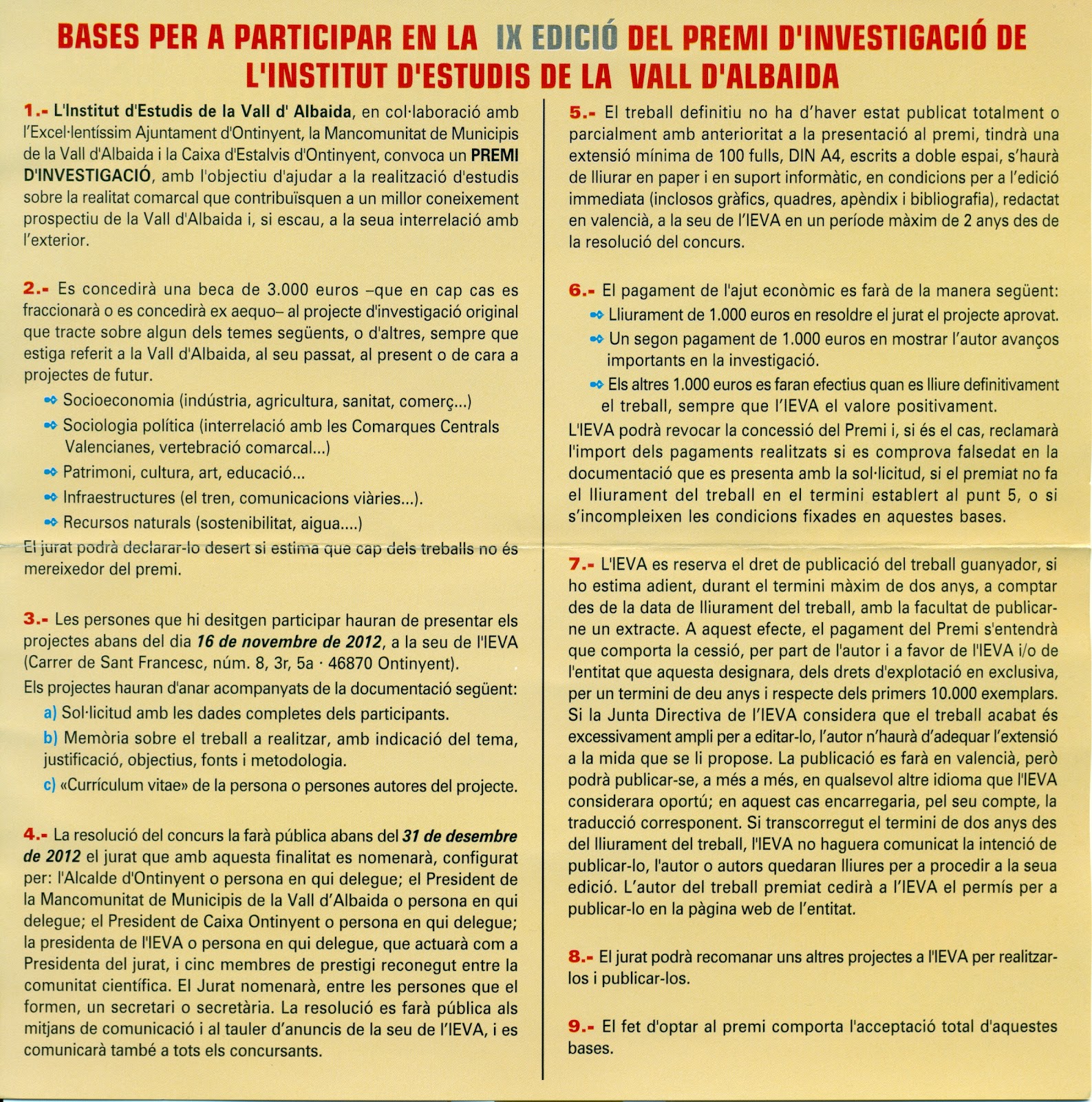 L’Institut d’Estudis de la Vall d’Albaida ha tret en col·laboració amb l’Ajuntament d’Ontinyent i la Caixa d’Estalvis d’Ontinyent la convocatòria a la nova edició de premis d’investigació de la Vall d’Albaida.